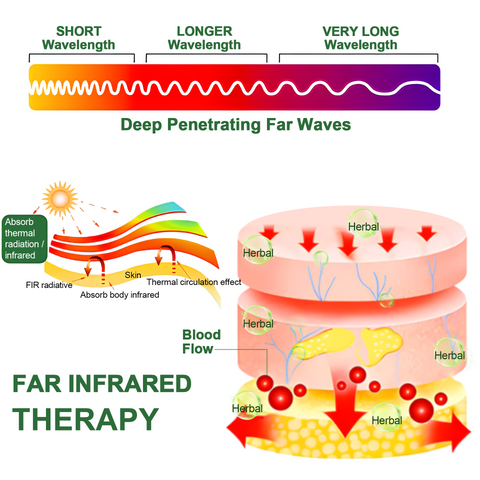Far infrared is a region of the infrared spectrum of electromagnetic radiation. Far infrared rays can penetrate 16mm of human subcutaneous tissue, which means it could penetrate through deep muscle tissue, tendons, nerves, blood vessels and ligaments and help to repair damaged cells, expand micro vessels, promote blood circulation, activate enzymes, and accelerate the metabolism of blood and cell tissues. It does this by warming up the body and encourages heart rate and activity even when you're not exercising. It also boosts blood flow, circulation, and the body's enzyme and hormone production which are essential in fat burn and weight loss.